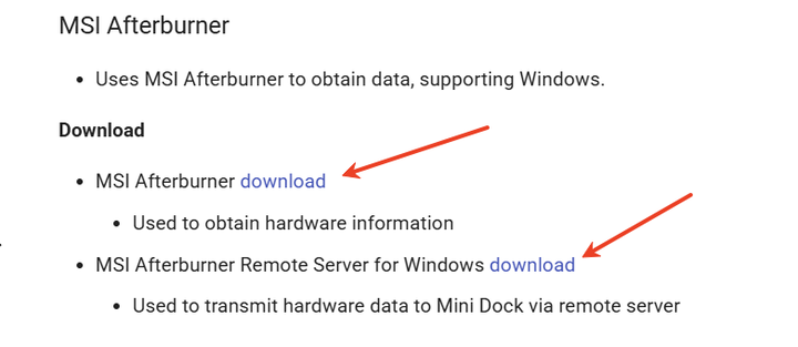 Furthermore, it’s important to note that if computer_monitor.exe and AIDA64 are running simultaneously, AIDA64 is used to acquire computer data, while computer_monitor.exe only forwards data to the Mini Dock. Therefore, you need to ensure that AIDA64 can correctly acquire the CPU temperature. For downloading and configuring MSI Afterburner, please refer to the documentation: PC H/W Monitoring - Vobot Mini Dock
